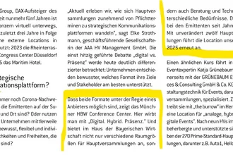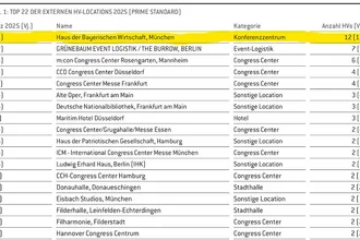 Das HV Magazin hat in der aktuellen Ausgabe 04/2025 wieder die HV-Locations mit den meisten Hauptversammlungen aufgezählt. Bei der Auswertung von GoingPublic werden alle Hauptversammlungen aus dem Prime Standard gezählt. Das Haus der Bayerischen Wirtschaft ist mit 12 Hauptversammlungen aus dem genannten Segment wieder auf Platz 1. Unser Dank gilt unseren treuen Kunden und Hauptversammlungsdienstleistern. Wir bedanken uns für die Zusammenarbeit in 2025 und freuen uns auf eine spannende Hauptversammlungssaison 2026.